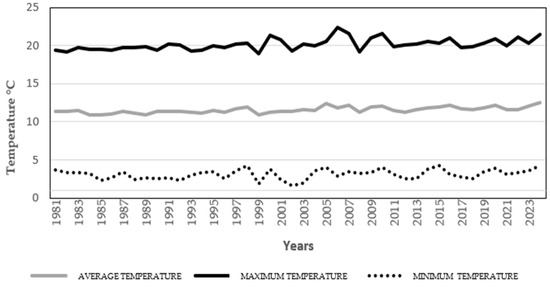 Temperature trend in the canton of Alausí, Ecuador (1981–2024). The graph displays average (gray), maximum (black), and minimum (round dots) temperatures in degrees Celsius. These long-term climatic patterns show a clear increase in the average and maximum temperature of the valley of Alausi and provide context for understanding seasonal and interannual variations in leishmaniasis transmission, particularly in relation to vector ecology and parasite development. Font: NASA.org.