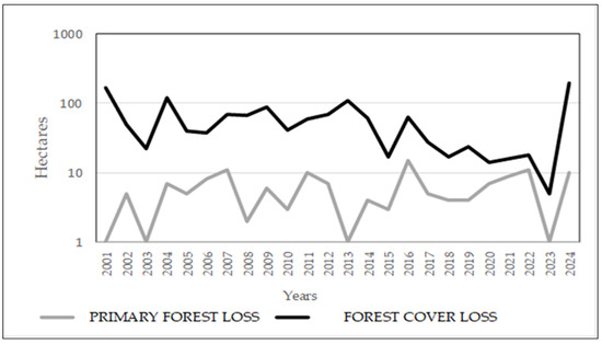 Loss of primary forest and tree cover in the Alausí area, Ecuador (2001–2024). The graph displays annual deforestation trends, with the blue line indicating loss of primary forest and the orange line representing overall tree cover loss, measured in hectares on a logarithmic scale. A continuous primary deforestation process is observed, which experienced a sharp increase in 2024, contributing to the loss of tree cover. Font: Global Forest Watch.