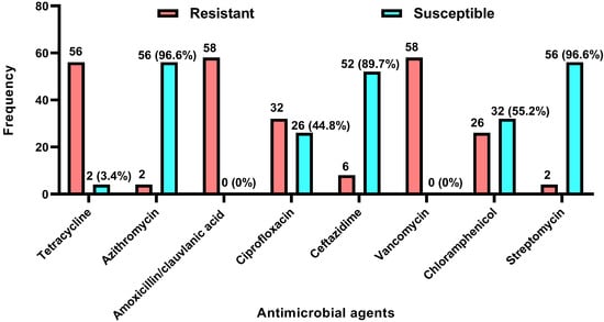 All 58 Campylobacter isolates demonstrated multidrug resistance, showing non-susceptibility to at least one antimicrobial agent in three or more distinct antimicrobial classes with different structural and mechanistic properties. All isolates were non-susceptible to both amoxicillin/clavulanic acid (30 µg) and vancomycin (30 µg). The most effective antimicrobial agents against the isolates were azithromycin (96.6%, 56/58), streptomycin (96.6%, 56/58), ceftazidime (89.7%, 52/58), chloramphenicol (55.2%, 32/58), and ciprofloxacin (44.8%, 26/58), as shown in Figure 1.