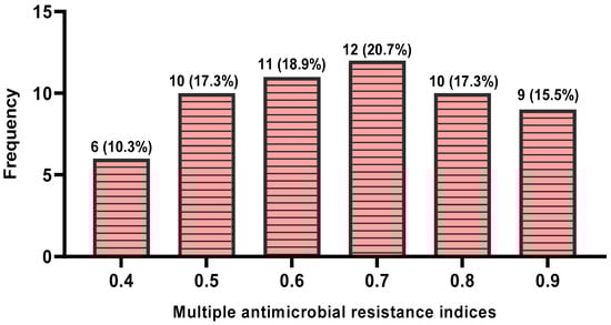 The isolates exhibited MAR indices values which ranged from 0.4 to 0.9, with an average MAR index of 0.7. Detailed results on the distributions of various MAR indices of the isolates are shown in Figure 2.