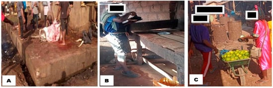 Images showing where slaughterhouse workers are seen standing on barefoot while processing carcass (A). One worker was observed eating within the facility (B), while another patiently waited to collect oranges purchased from a vendor at the slaughterhouse (C).