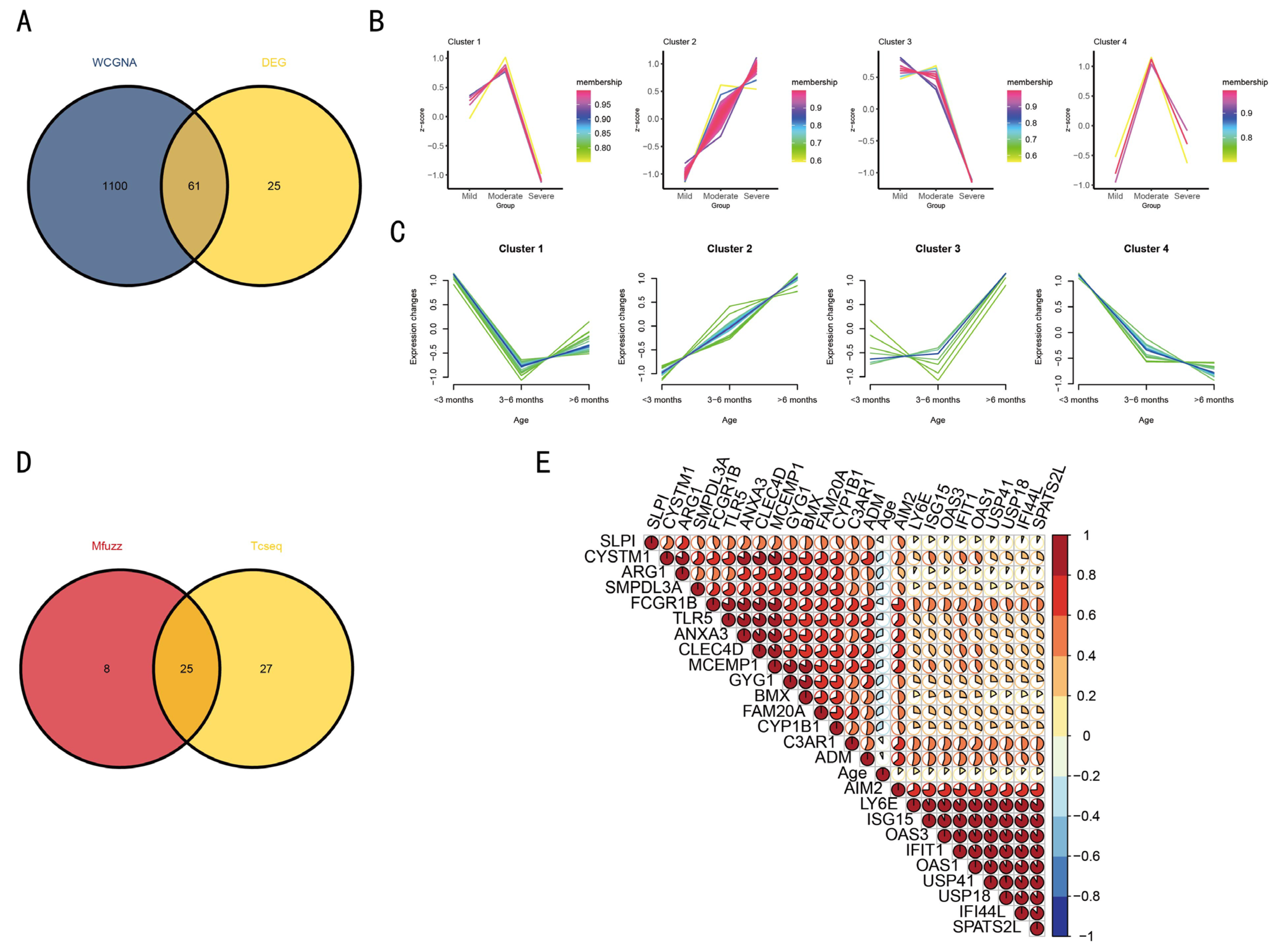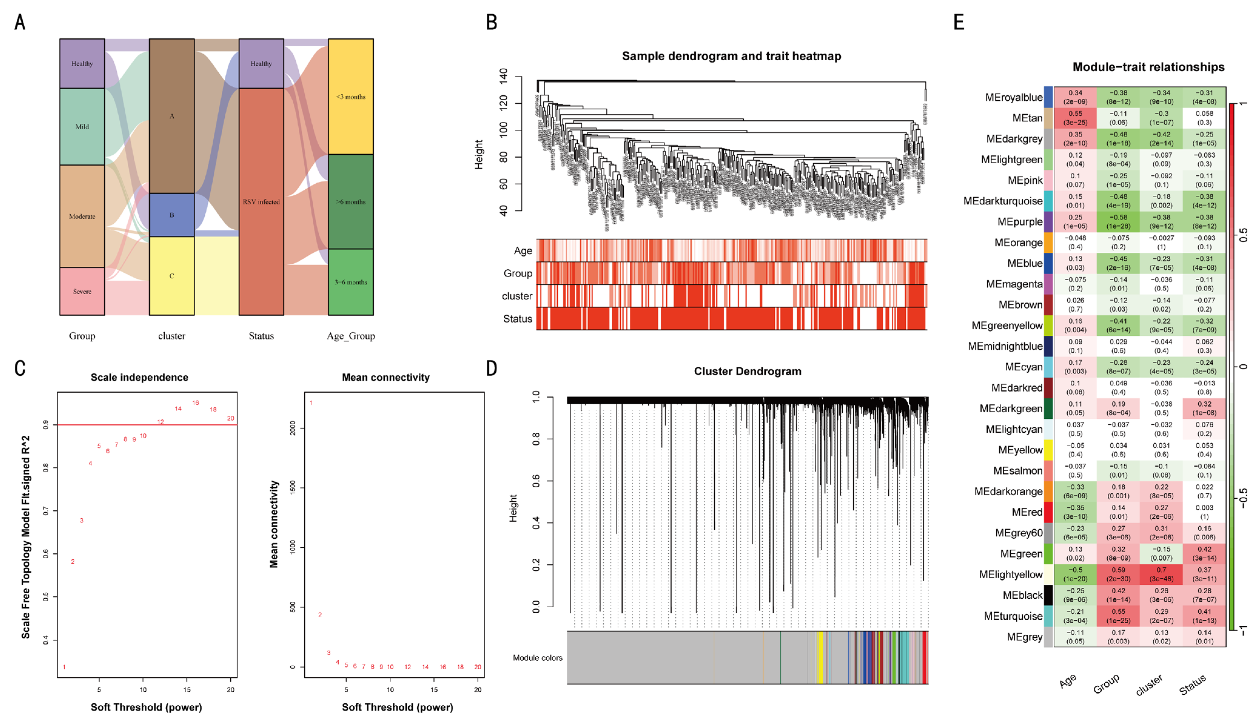 3.4. Co-Expressed Genes Related to Age, Group (Severity of Infection), Cluster, and Status (Infection Status)
