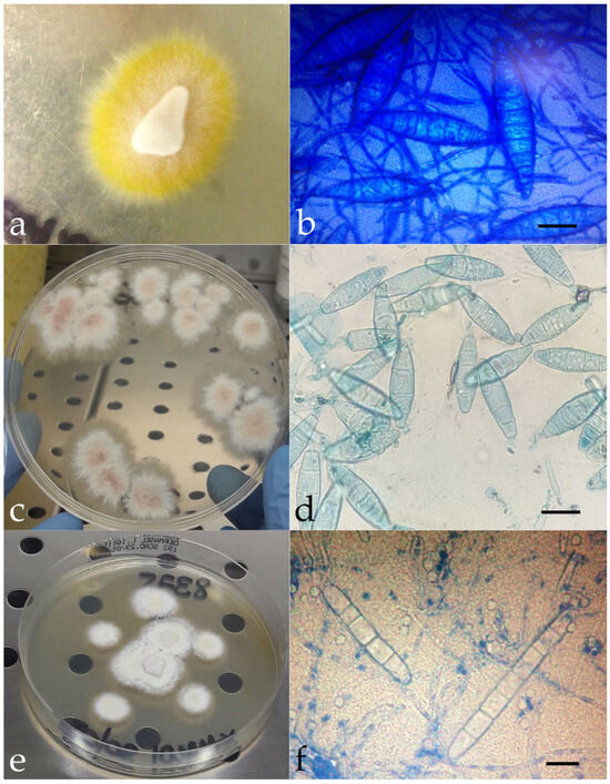 Mycological investigations conducted on human, animal, and environmental samples showed flat, powdery colonies with ragged margins and a lemon-yellow reverse in cases 1, 3, 5, and 6 (Figure 2a). Colonies with similar macroscopic features and a wine-colored reverse were obtained in cases 4, 7, and 8 (Figure 2c). Microscopically, these colonies showed fusiform and multiseptate macroconidia (Figure 2b,d). In case 2, the colonies appeared whitish with smoother margins and a more cottony texture (Figure 2e); cigar-shaped structures were visible microscopically, suggesting Trichophyton as the likely genus (Figure 2f).