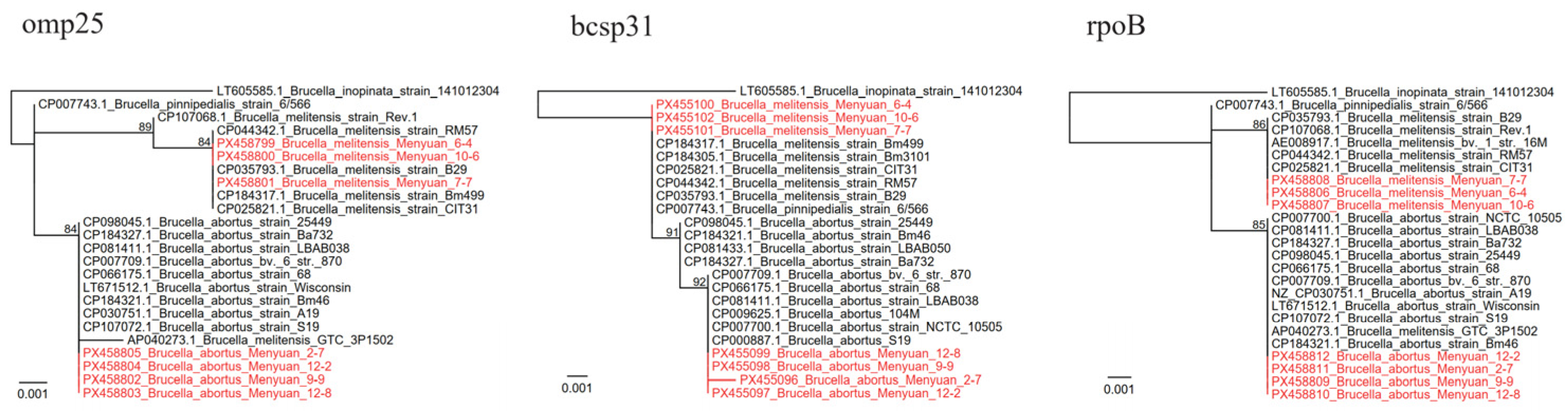 - Ma, J.Y.; Wang, H.; Zhang, X.F.; Xu, L.Q.; Hu, G.Y.; Jiang, H.; Zhao, F.; Zhao, H.Y.; Piao, D.R.; Qin, Y.M.; et al. MLVA and MLST typing of Brucella from Qinghai, China. Infect. Dis. Poverty 2016, 5, 26. [Google Scholar] [CrossRef]