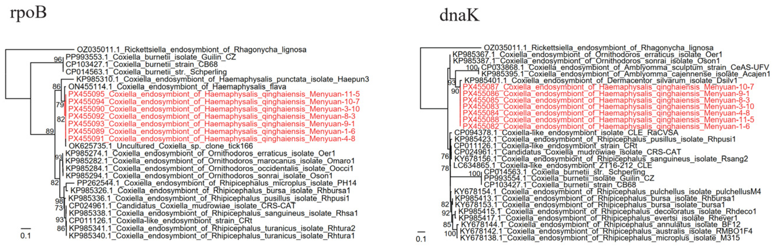 | Coxiella | Coxiella endosymbiont of H. qinghaiensis | 88/90 (97.78%) | 44/46 (95.65%) | 132/136 (97.06%) |