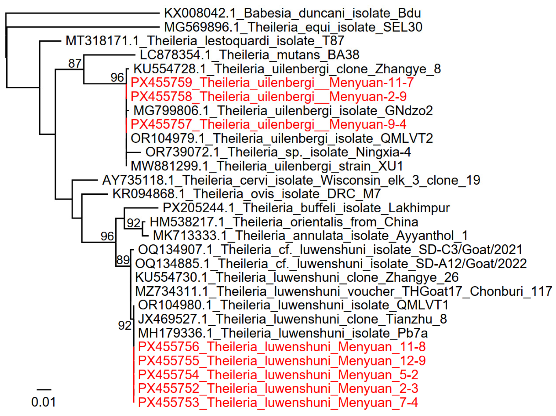 | Theileria | Theileria luwenshuni | 79/90 (87.78%) | 23/46 (50.00%) | 102/136 (75.00%) |