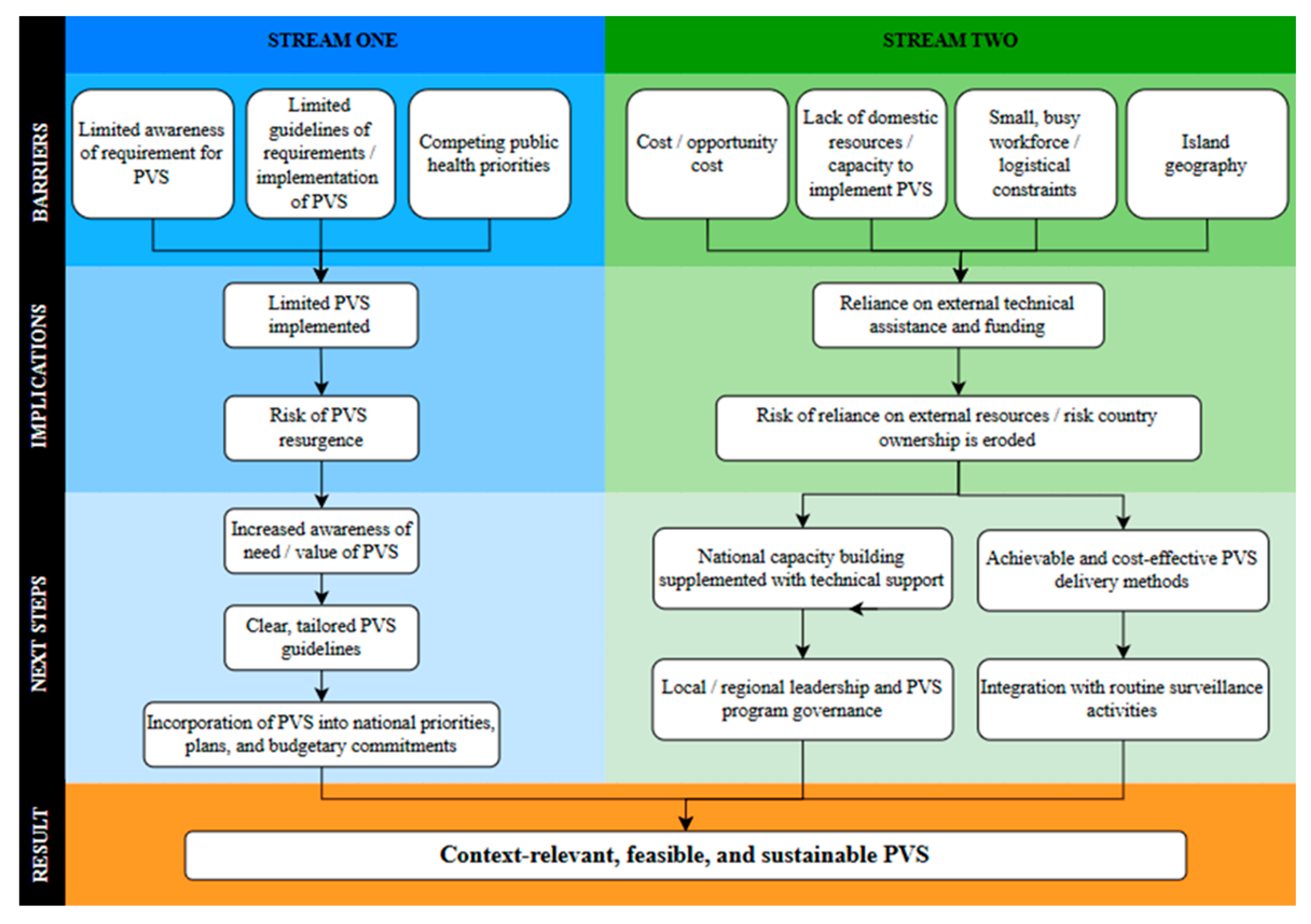 These barriers were classified into two streams: Stream One Barriers related to barriers caused by limited awareness and guidelines on PVS requirements as well as competing national health priorities, and Stream Two Barriers related to cost (financial barriers), resource (including staffing, time, and infrastructure), and logistical barriers. The barriers, implications of these barriers, and possible next steps for each stream are presented below.