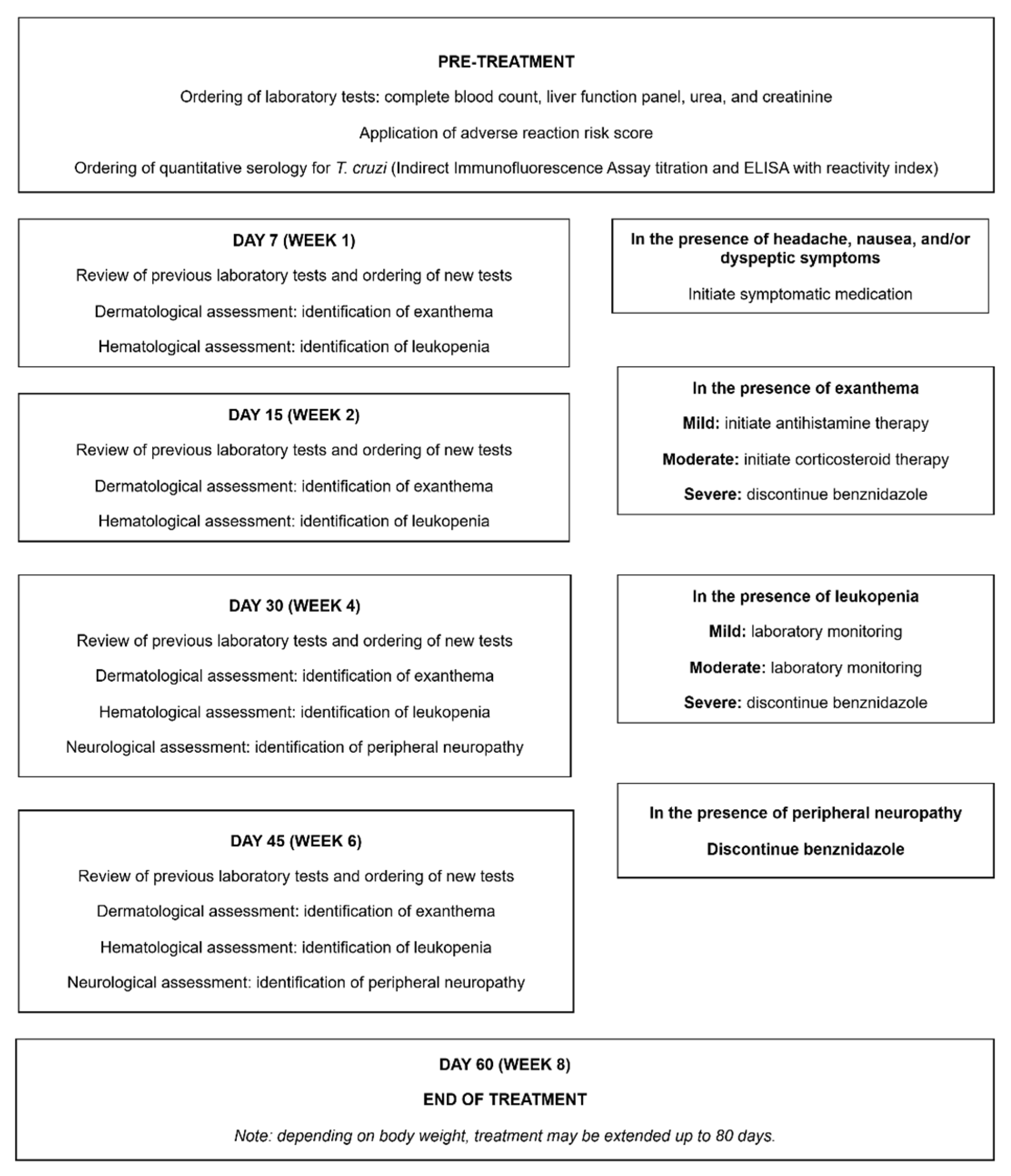 Trypanocidal treatment is strongly recommended for children and adolescents, who have greater chances of cure, and for women of childbearing age, to prevent vertical transmission. In adults, treatment is also important, as it may reduce disease progression, prevent complications, and improve long-term outcomes, particularly in patients younger than 50 years and those without severe cardiac involvement. Both guidelines also stress the importance of monitoring adverse events throughout therapy and recognize the need for dose adjustment or discontinuation in cases of severe reactions [