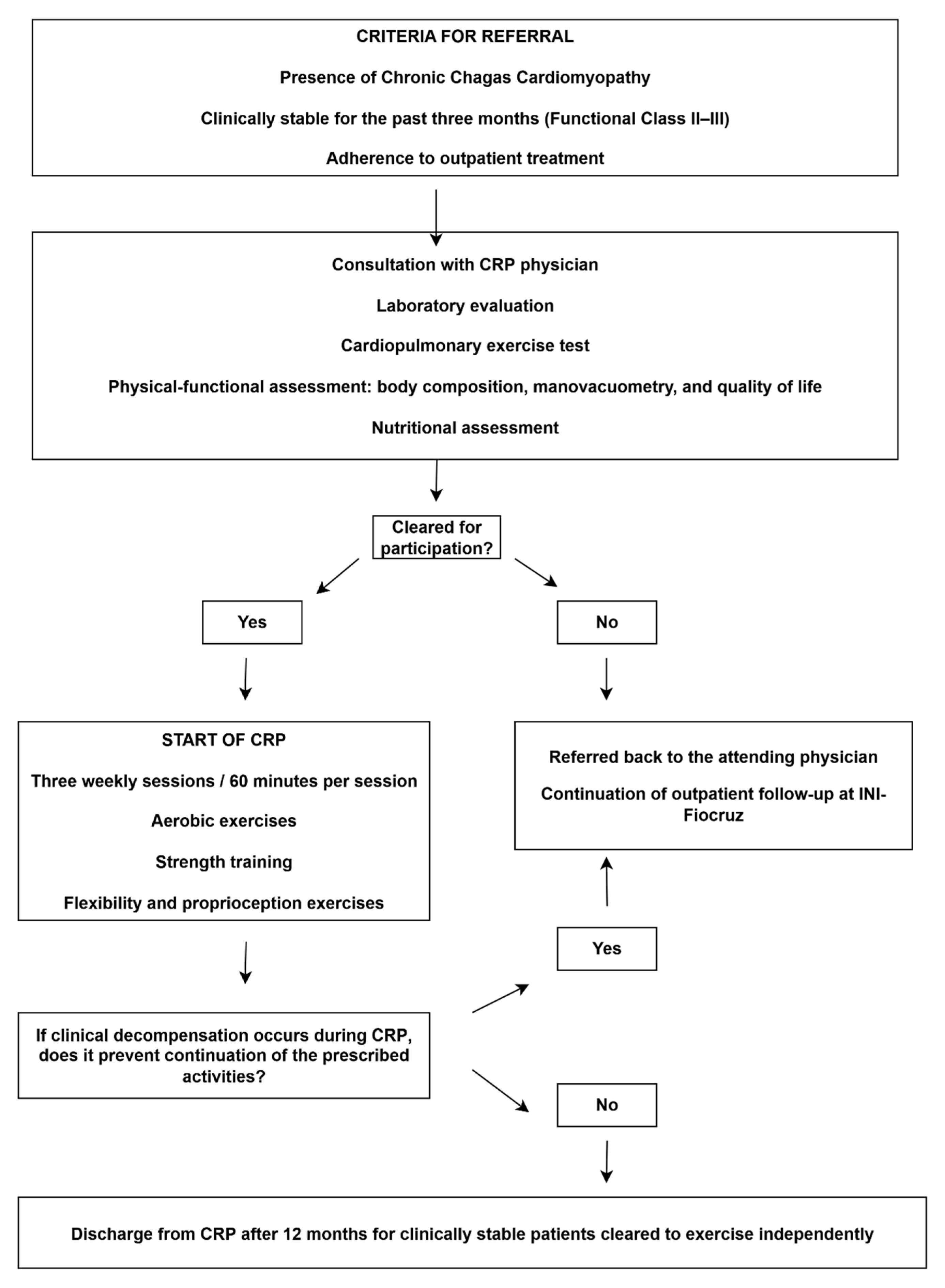 The cardiopulmonary rehabilitation program (CRP) at INI/Fiocruz delivers specialized care to patients with CCC through a multidisciplinary team comprising physicians, physiotherapists, exercise physiologists, nutritionists, pharmacists, and nursing staff. Admission criteria include patients with CCC (all stages), clinical stability for at least three months, adherence to optimized pharmacological therapy, and commitment to participate in two to three supervised sessions per week for a minimum of 12 months.