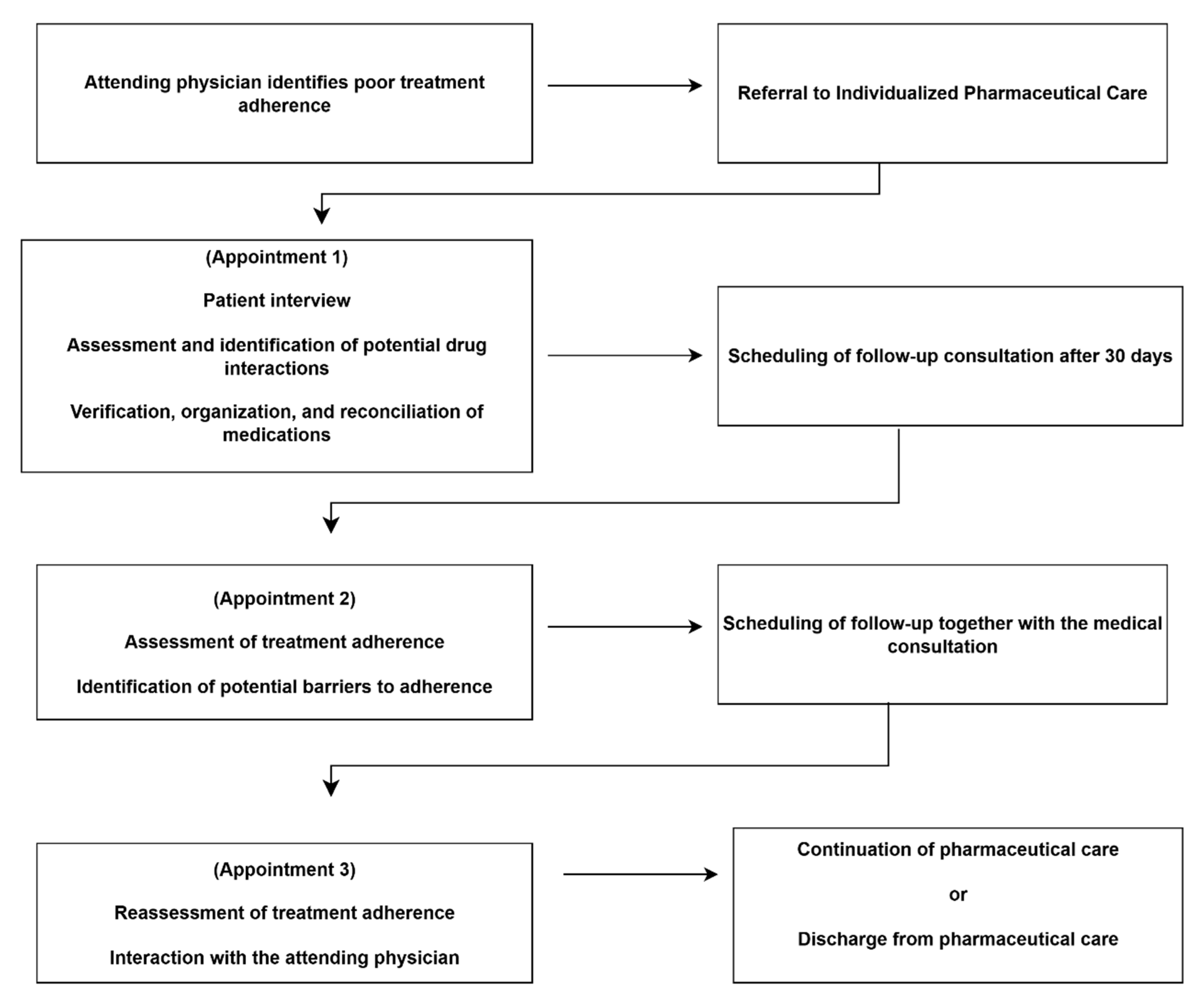 Referrals to pharmaceutical assistance are made by the attending physician when barriers to medication use are identified during routine visits. During the pharmaceutical consultation, patients are interviewed regarding challenges in medication management, meal schedules, work routines, interactions with household family members, and healthcare received at other health facilities outside INI/Fiocruz. The goal is to identify concomitant use of medications not dispensed at INI/Fiocruz.