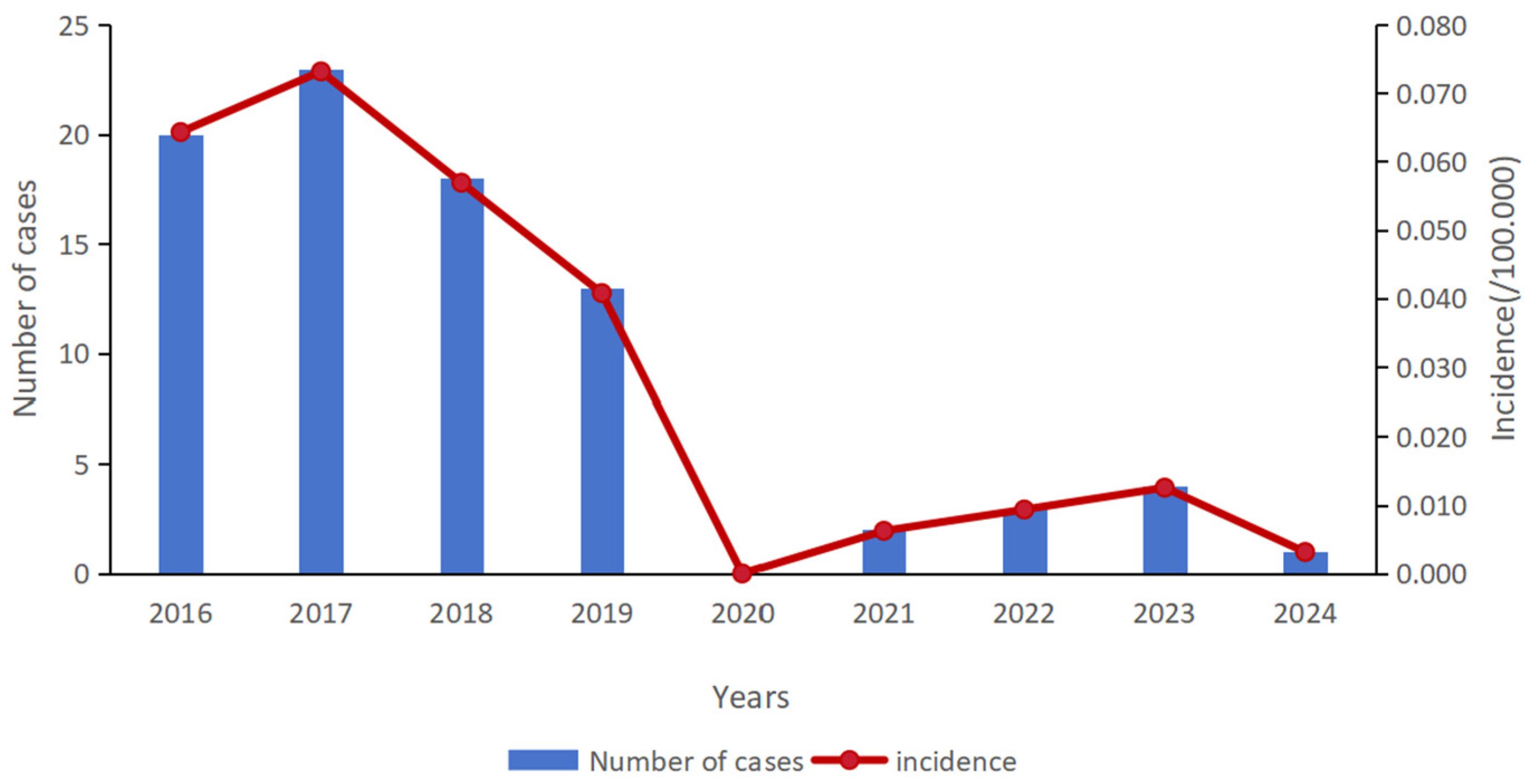 Chicago/Turabian StyleChen, Longyu, Yi Yuan, Yu Xia, Jiang Long, Zhijin Li, Tingting Li, and Li Qi. 2026. "Epidemiological Characteristics of Human Rabies in Chongqing, China, 2016–2024" Tropical Medicine and Infectious Disease 11, no. 1: 30. https://doi.org/10.3390/tropicalmed11010030