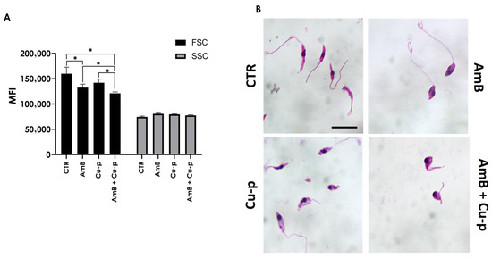 Effects of the combination of ½ × IC50 Cu2+-phendione (Cu-p) and ¼ × IC50 Amphotericin B (AmB) on the morphology of L. amazonensis promastigotes. (A) Promastigotes were treated or not (CTR) with either Cu-p, AmB or with the combination (AmB + Cu-p) for 48 h and analyzed by flow cytometry. Cell size (FSC) and granularity (SSC) were expressed as mean fluorescence intensity (MFI). Data are presented as mean ± standard deviation from three independent experiments performed in triplicate, with 10,000 cells analyzed. Results with p < 0.05 (*) were considered significant. (B) In parallel, promastigotes were fixed with methanol, stained with Giemsa, and analyzed by light microscopy. Control promastigotes display the kinetoplast (k) at the anterior region, a central nucleus (n), and a flagellum (f) connected to the cell body. Scale bar = 5 μm.