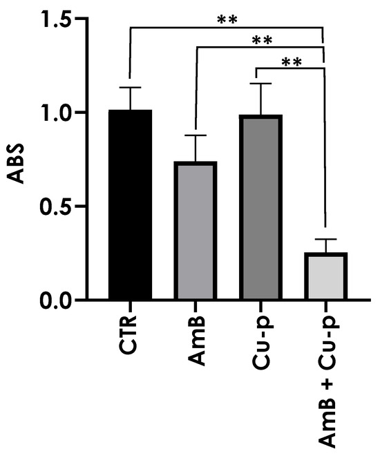 Effects of the combination of ¼ × IC50 Amphotericin B (AmB) with ½ × IC50 Cu2+-phendione (Cu-p) on mitochondrial metabolism in L. amazonensis promastigotes. Parasites were incubated for 48 h in the absence (CTR) or presence of ¼ × IC50 AmB, ½ × IC50 Cu-p, either alone or in combination (AmB + Cu-p). MTT was then added to the cultures, followed by incubation for 3 h at 28 °C. The supernatant was removed, and the resulting formazan crystals were dissolved in DMSO. Absorbance (ABS) was measured at 490 nm using a microplate reader. Data are presented as mean ± standard deviation from three independent experiments performed in triplicate, with 10,000 cells analyzed. Results with p < 0.005 (**) were considered significant.
