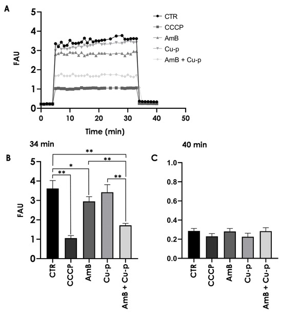 Mitochondrial membrane depolarization was evaluated using JC-1 staining. Treatment with ¼ × IC50 AmB caused a significant 18% reduction in ΔΨm compared with control cells, an effect not observed with ½ × IC50 Cu2+-phendione (Figure 7A,B). In contrast, the combined treatment produced a markedly greater decrease in ΔΨm, with a 52% reduction relative to the control and reductions of 41% and 49% compared with AmB and Cu2+-phendione alone, respectively (Figure 7A,B). Pre-incubation of parasites with CCCP induced a significant reduction in ΔΨm, and addition of the mitochondrial protonophore after 34 minutes resulted in complete mitochondrial membrane depolarization in all systems (Figure 7C).