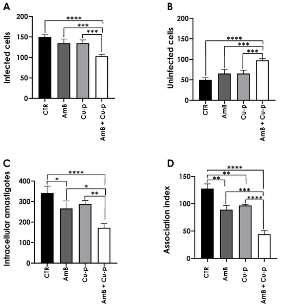 Effects of pre-treatment of L. amazonensis promastigotes with the combination of ¼ × IC50 Amphotericin B (AmB) with ½ × IC50 Cu2+-phendione (Cu-p) on the interaction with THP-1 mammalian cells. Parasites were pre-treated or not (CTR) for 4 h with ¼ × IC50 Amphotericin B (AmB) and ½ × IC50 Cu2+-phendione (Cu-p), either alone or in combination. Subsequently, parasites were incubated with THP-1 cells at a parasite/host cell ratio of 10:1 at 37 °C for 24 h. After incubation, cells were Giemsa-stained, and 200 cells were counted per slide in triplicate using light microscopy. Graphs show the number of infected cells (A), non-infected cells (B), intracellular amastigotes (C), and the association index (D). Data are presented as mean ± standard deviation from three independent experiments performed in triplicate, with 10,000 cells analyzed. Results with p < 0.05 (*), p < 0.005 (**), p < 0.001 (***) and p < 0.0001 (****) were considered significant.
