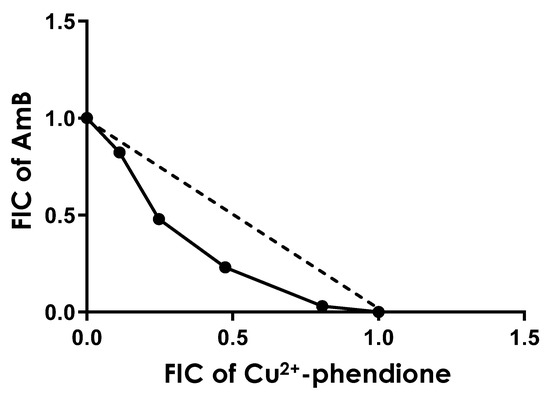 The fractional inhibitory concentration (FIC) was determined for both AmB and Cu2+-phendione by dividing the IC50 value of each compound in combination by the IC50 value of each compound alone. The sum of the FICs (ΣFIC) for each ratio was determined, and the arithmetic mean of ΣFIC in each combination was calculated to infer the type of interaction between the compounds based on the following values: synergic (ΣFICs ≤ 0.5), additive (0.5 < ΣFICs ≤ 2.0) or antagonic (ΣFICs > 2) [39]. For each drug combination and susceptibility assay, three independent experiments were conducted. FIC values of each drug ratio were used to build an isobologram.