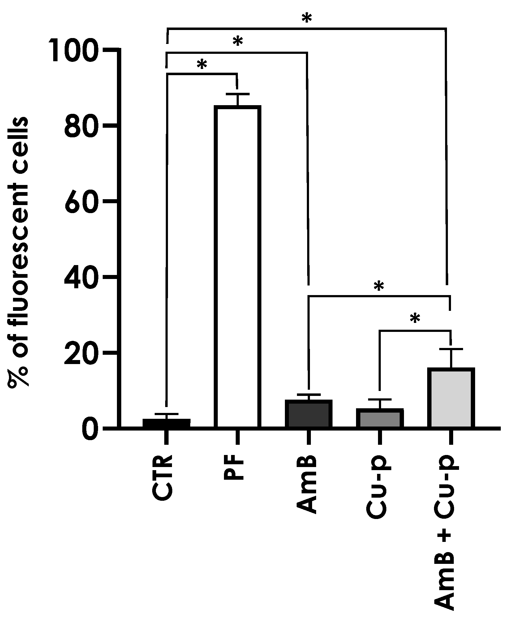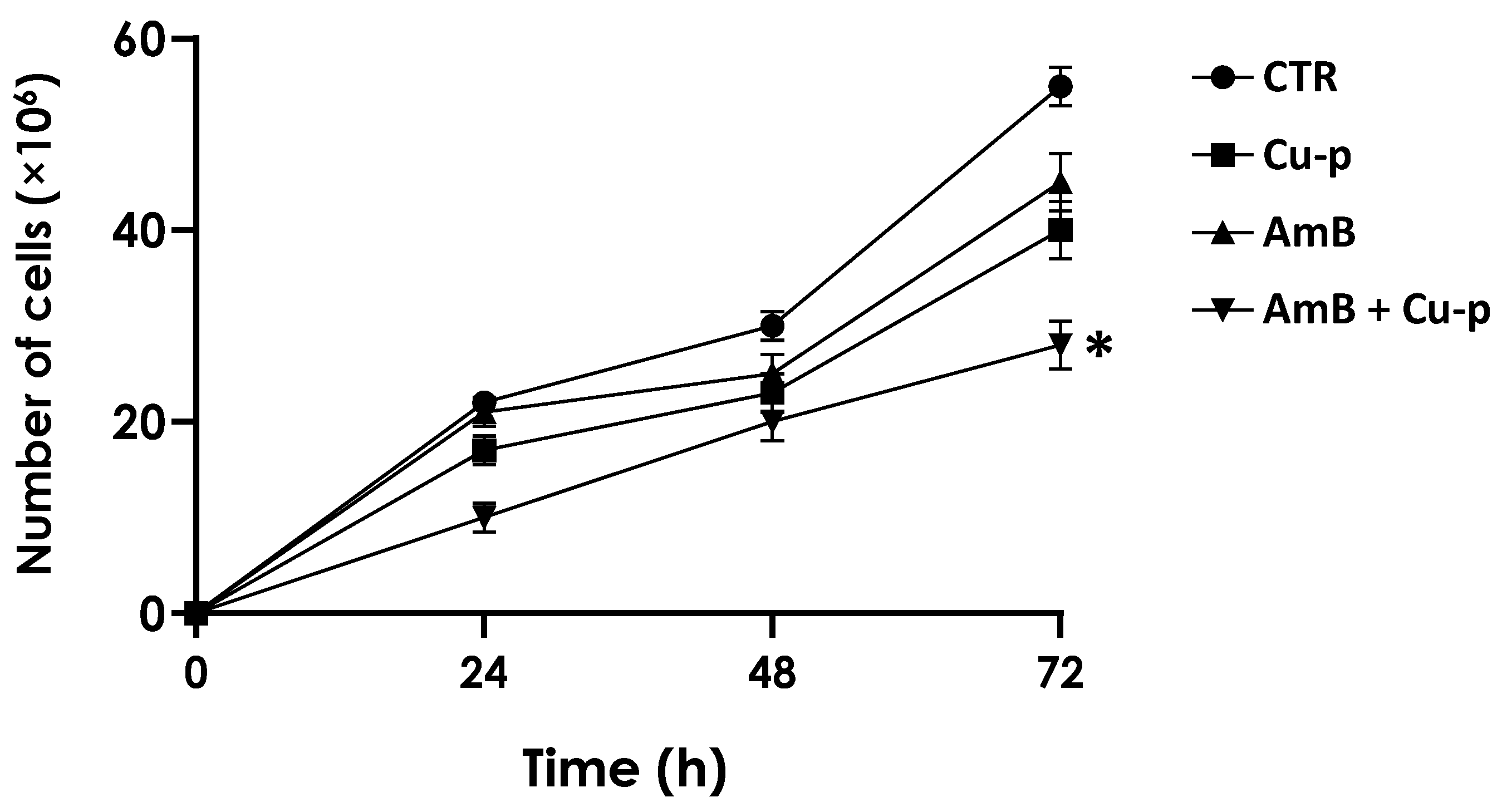 2.3. Effect of AmB and Cu2+-Phendione on the Growth Rate of Promastigotes