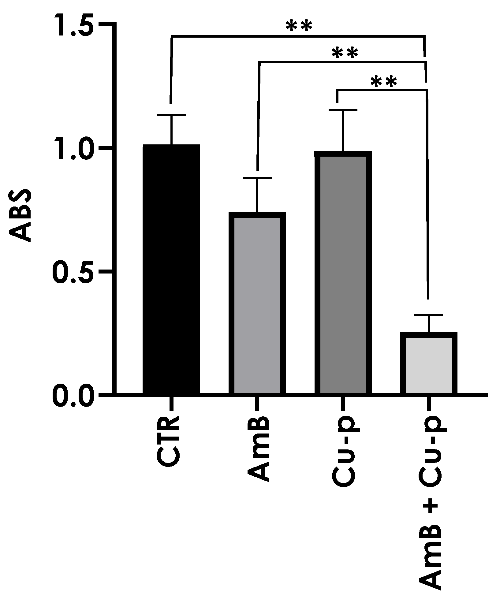 3.9. Type of Interaction of AmB and Cu2+-Phendione