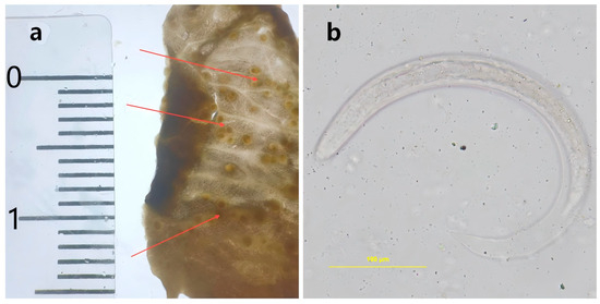 The entire structure of the lung sac was observed under a dissecting microscope. If larval nodules are present in the cyst wall tissue, they are carefully isolated and transferred onto a glass slide. A coverslip is then placed over the nodules, and gentle pressure is applied to squash them. The worm species were subsequently identified under the microscope [23,24]. L3 are larger at 425–550 µm in length, featuring a notched tail with a pointed terminal projection and often encased in sheathed exuviae from previous molts. Given the presence of nodules and the observation of larvae under the microscope, which matched the morphological characteristics of stage III A. cantonensis larvae, the samples can be classified as positive. Morphological examination was used as a preliminary screening method based on established descriptions, while final species identification relied on molecular confirmation.