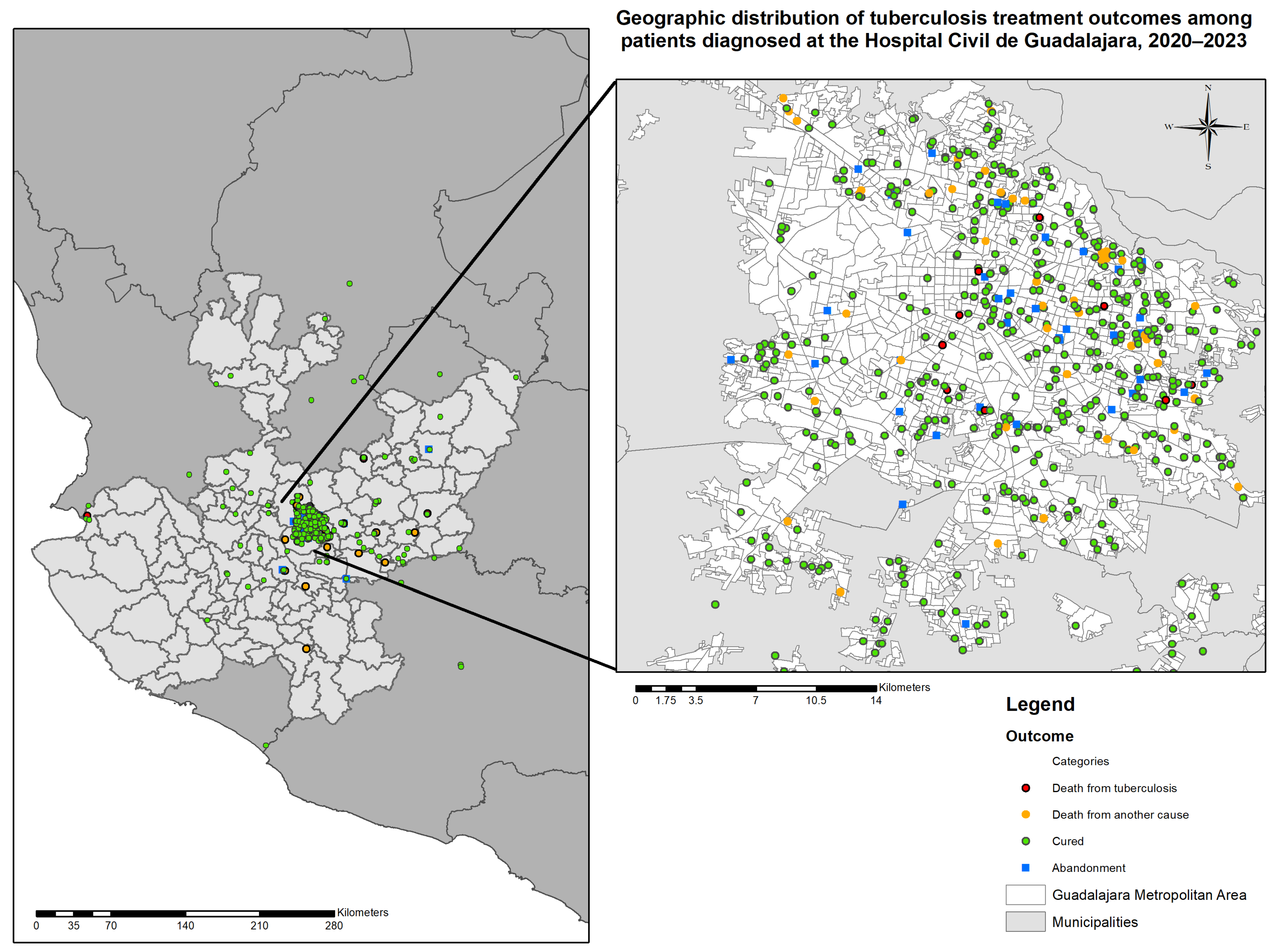 A descriptive observational study was conducted to evaluate tuberculosis treatment outcomes using spatial analysis techniques to map the distribution of treatment results and assess their association with sociodemographic and clinical variables at the Hospital Civil de Guadalajara “Fray Antonio Alcalde” in Jalisco, Mexico, from January 2020 to December 2023. All patients diagnosed during the study period were included, and their demographic, clinical, and treatment data were collected for subsequent analysis.