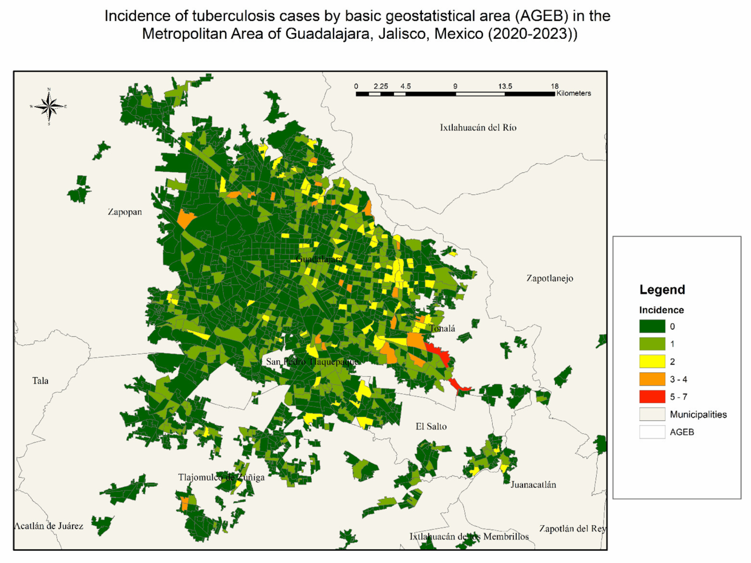 14]. Individual-level geocoded residential addresses were first aggregated to the AGEB level, which represents the smallest census unit available for population-based spatial analyses in Mexico. Each TB case was assigned to its corresponding AGEB based on residential location at the time of diagnosis.