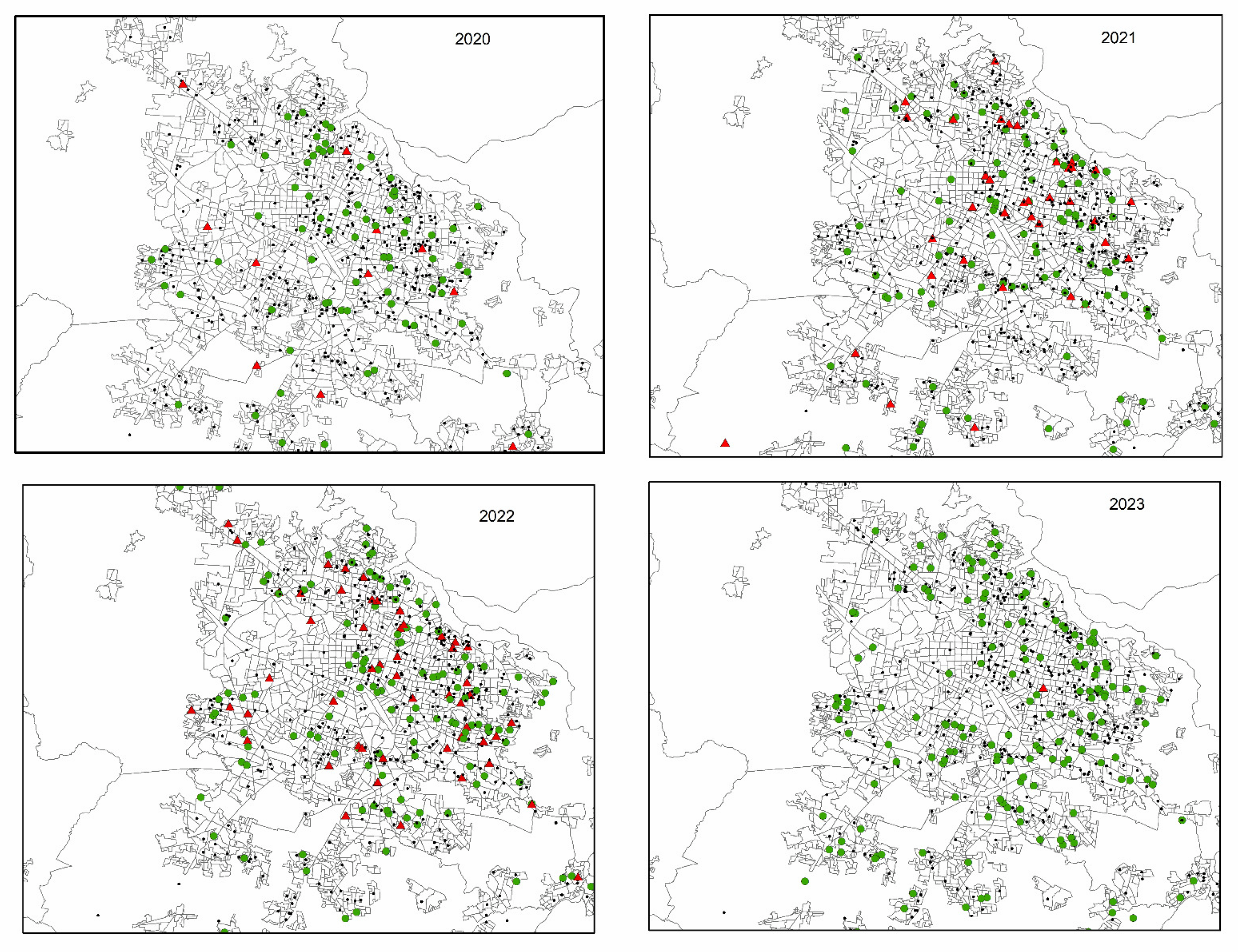 All successfully geocoded locations were visually inspected to ensure consistency with the reported municipality and Basic Geostatistical Area (AGEB). Formal quantification of positional uncertainty was not performed; however, geocoding accuracy was considered adequate for AGEB-level aggregation and spatial pattern analysis.
