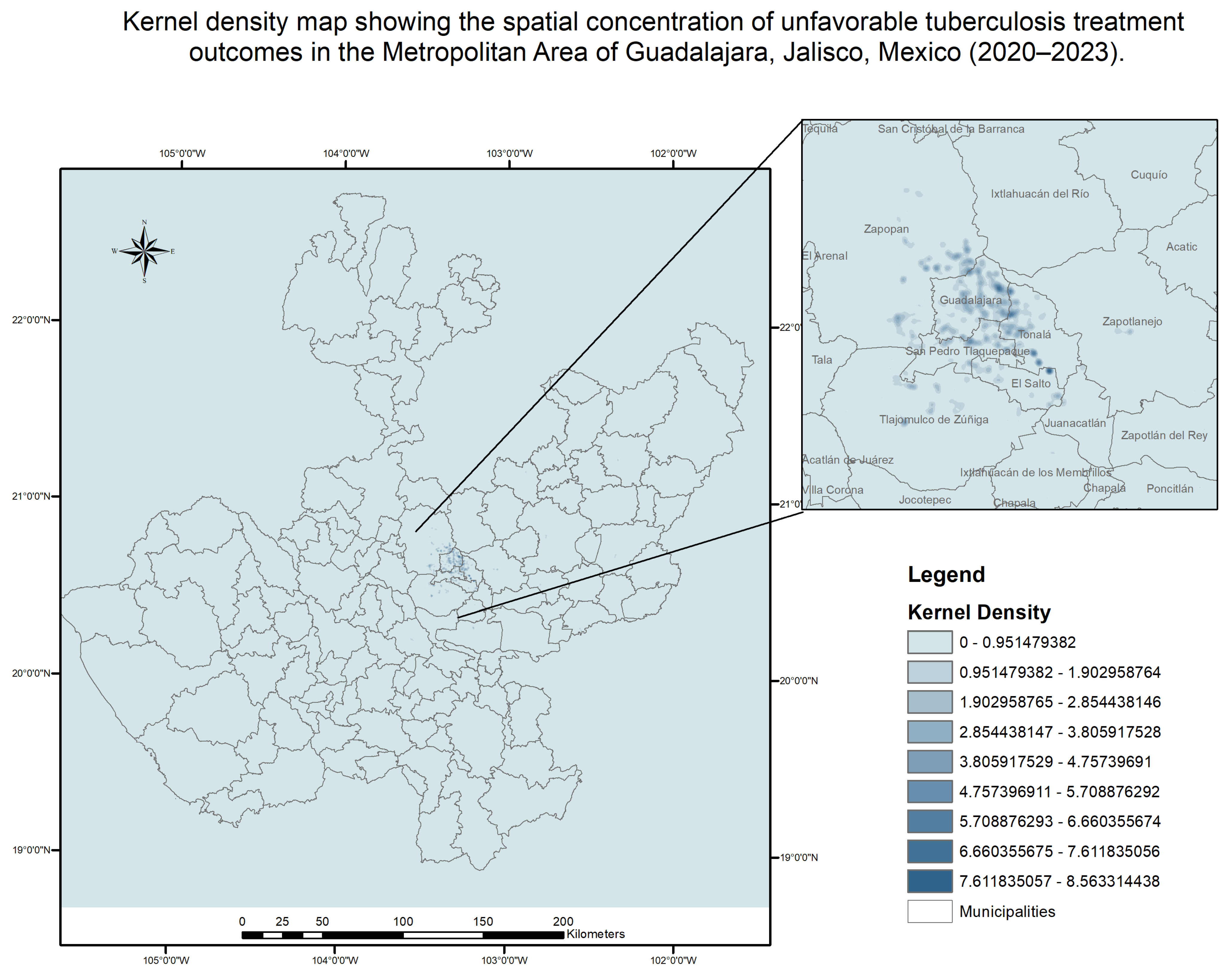 Kernel Density Estimation was performed using a Gaussian kernel function with a fixed bandwidth selected according to ArcGIS Pro default optimization parameters, expressed in meters, to identify areas of higher concentration of unfavorable treatment outcomes without administrative boundary constraints.