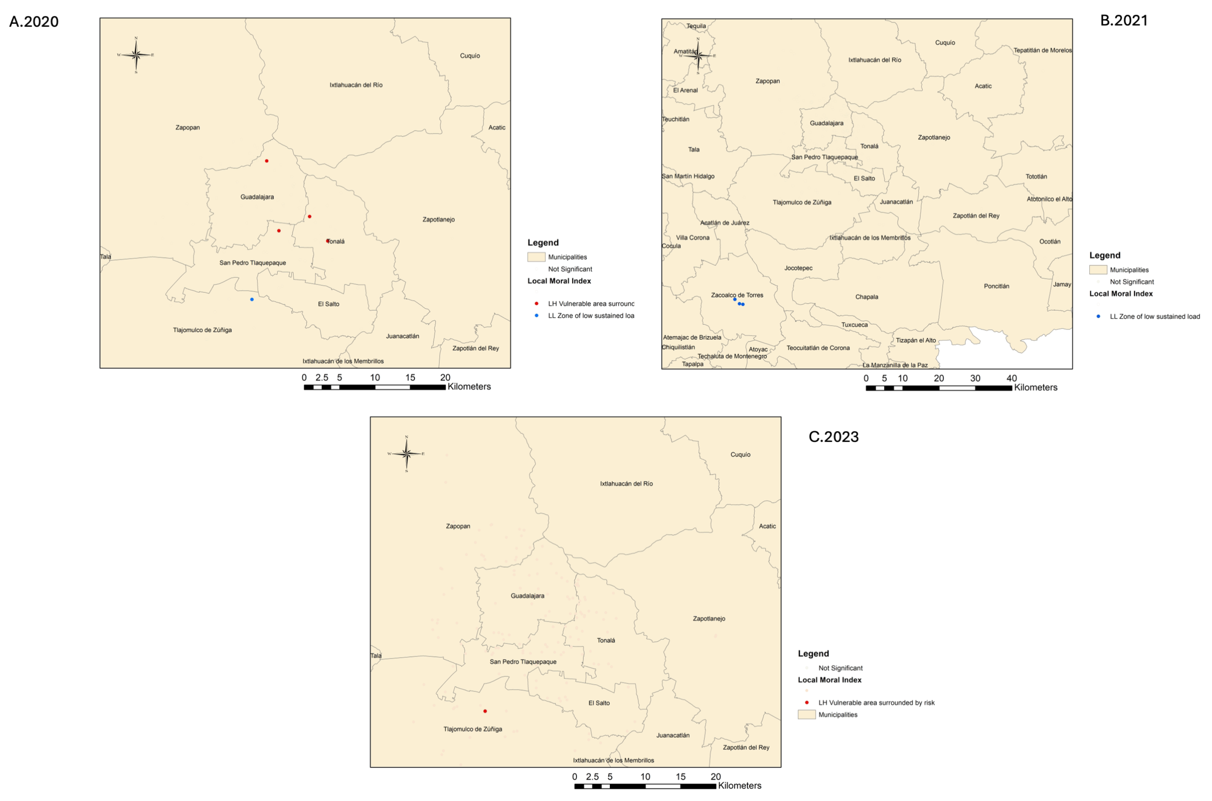 Spatial clustering of tuberculosis cases was evaluated using the Local Indicators of Spatial Association (LISA), specifically the Local Moran’s I (Anselin) statistic, computed annually for the years 2020 to 2023. The analysis was performed at the municipality level within the Guadalajara Metropolitan Area, based on the number of confirmed TB cases per municipality. Crude case counts were used for the calculation of spatial autocorrelation, and a false discovery rate (FDR) correction was applied to adjust for multiple comparisons. The classification of spatial outliers and clusters included high–high (HH), low–low (LL), high–low (HL), and low–high (LH) patterns, although only statistically significant clusters are shown [