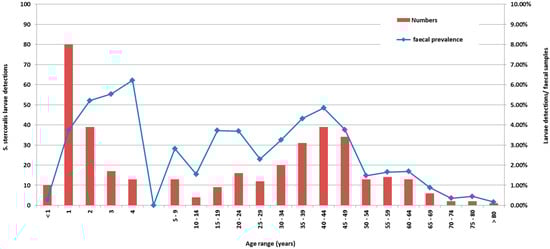 The main findings of this study include: (i) the declining rate of S. stercoralis detection over the 11 years of this study, which mirrors the previously noted decline of two other helminths, namely, hookworm, [] and whipworm []; (ii) the biphasic age distribution of the patients with larvae detection; and (iii) S. stercoralis infections’ poor correlation with the presence of eosinophilia, particularly in detections in patients over the age of five, where eosinophilia was present in only 40.8% of patients.