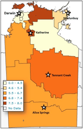 Geographic distribution of S. stercoralis larvae detection from patients in Northern Territory public healthcare facilities by geographic area of residence from 2002 to 2012. Prevalence figures are S. stercoralis larvae diagnostic detections in public health laboratories/10,000 Indigenous population/year.
