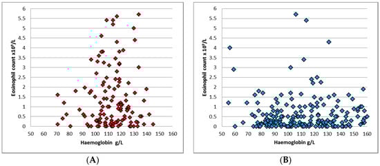 Distribution of contemporaneous haemoglobin and eosinophil counts in patients with S. stercoralis larvae detection. (A) Patients five-years-old and under (red diamonds represent the individual data points). (B) Patients aged older than five years of age (blue diamonds represent individual data points).