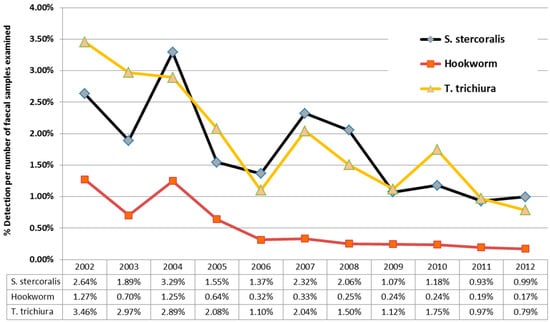 Comparative yearly detection of soil-transmitted helminths in the Northern Territory public laboratories, 2002 to 2012, by yearly diagnostic prevalence.