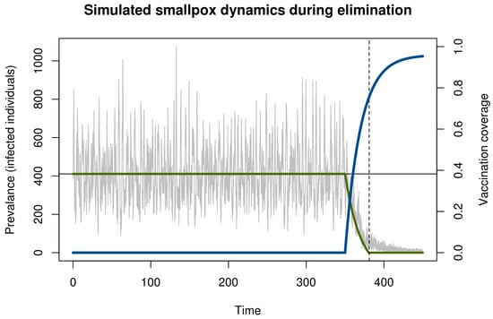 Simulation of smallpox elimination through vaccination. The gray line shows the number of infected individuals over time. The blue line shows vaccination coverage, which approaches a maximum at 0.96. The green line shows the deterministic equilibrium that would be achieved if the vaccination rate was held constant and the time-dependent value. Disease dynamics are given by a stochastic SIR model with states S, I, and R for the number of susceptible, infected, and immune persons, respectively; mean field equations dS/dt = μ(S + I + R)(1−ρ) − βSI/(S + I + R) – ξS − μS, dI/dt = βSI/(S + I + R) + ξS − μI − γI, and dR/dt = γI + μ(S + I + R)(ρ) − μR; and parameters for transmission β = R0(γ + μ) ≈ 121.7, recovery γ = 365/12 ≈ 30.4, demography μ = 1/60, externally acquired infection ξ = 0.001, speed of vaccination roll out σ = −0.05, maximum possible vaccination coverage a = 0.96, and time that vaccination begins s = 100. All rates are in units of years. The function ρ(t) = a(1 − exp[σ(t − s)]) is the time-dependent vaccination rate. Total population size in this simulation was 100,000 individuals. Solutions were obtained using the adaptive tau-leaping algorithm []. Parameters follow Ferguson et al. [].