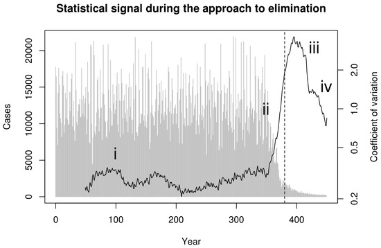 In conclusion, these examples demonstrate two key properties of the dynamics of an infectious disease on the road to elimination. First, there is an inevitable delay between the time that the elimination threshold is achieved and the time that the last infected individual acquires infection. This is related to the phenomenon of bifurcation delay, described by Dibble et al. [] in the context of disease emergence. Second, the statistical properties of fluctuations in the number of cases can indicate where along the path to elimination a particular population lies. In the approach to the vaccination threshold studied here, the coefficient of variation in a moving window increased continuously with vaccination pressure, providing a possible way to document gains from increases in effort. Areas for further research include determining what statistics—among dozens now available []—give both sensitive and specific warning of epidemiological transitions [,], and whether or not spatially explicit analogs of the approach taken here may be more powerful []. Additionally, it will be important to establish how well these indicators perform under the more complicated conditions that affect real elimination campaigns, including spatial heterogeneity, control programs that may be intermittent or vary in intensity, and seasonal forcing. Moreover, further theoretical research is needed to establish that critical slowing down will be detectable in parasites with more complicated life cycles (i.e., schistosomes and Guinea worm). The evidence so far—primarily from analysis of the near-critical dynamics of the Ross–MacDonald model—suggests that vector-borne diseases like malaria are predicted to display critical slowing down [].