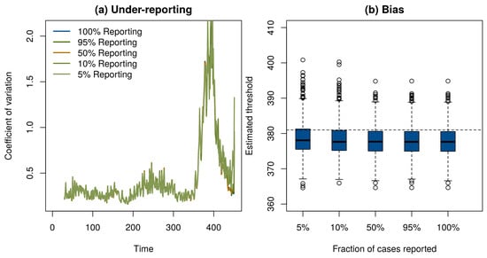(a) Under-reporting had negligible effect on the ability of the moving window coefficient of variation to respond to the approach to the vaccination threshold. (b) A hyperbolic approximation was used to forecast the time the vaccination threshold would be reached. The estimated crossing time in 1000 simulations (boxplots) was on average slightly earlier than the true time of year 381 (horizontal dashed line). Under-reporting had little effect on the precision or bias of predictions.