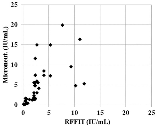 Comparison of rVNA titers (IU/mL) measured by the micro-neutralization test (microneut.) and RFFIT. Rabies virus neutralizing antibody was measure in individual serum samples by the micro-neutralization test (Microneut.) and RFFIT. Positive rVNA titers in IU/mL were plotted on a linear scale. The axis limits exclude four samples that had very high rVNA titers by both tests. The geometric mean titer was 3.4 IU/mL with the micro-neutralization test compared to 2.0 IU/mL with the RFFIT.
