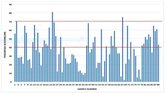 The distribution of percentage blocking values obtained from some of the bat sera obtained from Eidolon helvum from the central Plateau and North East Bauchi States of Nigeria. The red bars are the cut-off values (40% and 70%) with the former considered positive for rabies antibodies, and 70% considered as serum sample with antibody level equal to or higher than 0.5 IU/mL based on the FAVN test.