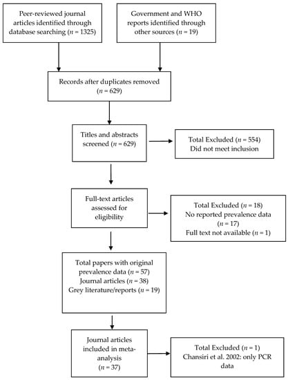 The search protocol identified 629 papers (Figure 1). Of these, 554 clearly did not meet the inclusion criteria (i.e., were review articles or did not include original prevalence data on infection or morbidity published since 1995 from the identified areas). From the remaining 75 records, 17 were excluded because they did not contain original prevalence data, and one because the full text was not available after contacting the author. The included 57 papers comprised 38 peer-reviewed journal articles and 19 grey literature reports [5,25,26,27,28,29,30,31,32,33,34,35,36,37,38,39,40,41,42,43,44,45,46,47,48,49,50,51,52,53,54,55,56,57,58,59,60,61,62,63,64,65,66,67,68,69,70,71,72,73,74,75,76,77,78,79]. With the exception of Chansiri et al. [30], which contained only polymerase-chain reaction (PCR) infection data, all studies were included in the meta-analysis.