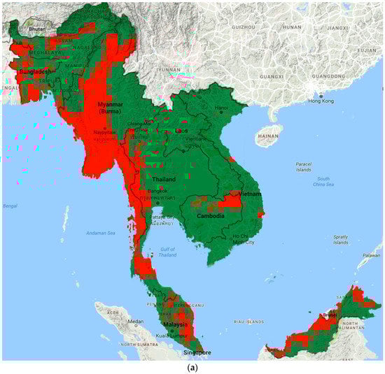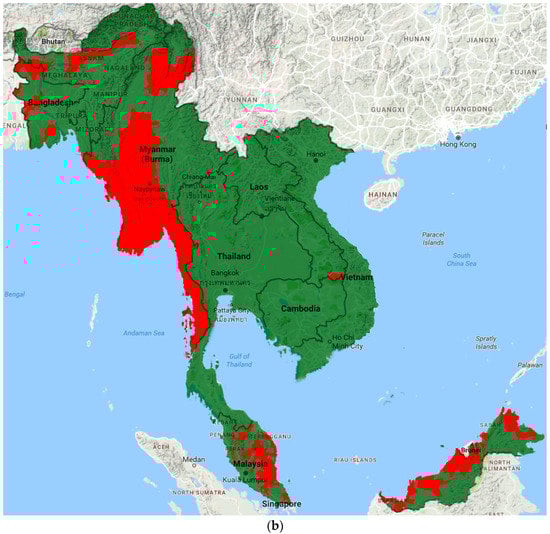 Distribution of LF endemic areas (red): (a) at baseline; and (b) based on most recent data.