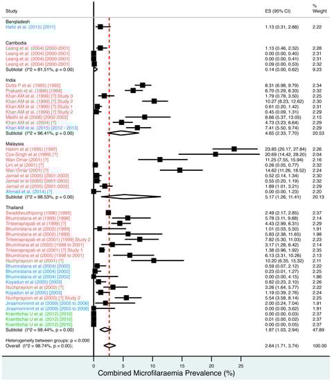 Despite the significant LF burden in this region, there remain limited reliable data on the current prevalence of infection and morbidity. Whilst previous reviews have examined this topic, all are significantly out-dated or incomplete [14,15,16]. Reliable, current data on the prevalence of LF are required for the implementation and evaluation of elimination programs as well as future advocacy efforts. Accordingly, we conducted a systematic review and meta-analysis of publicly-available data in studies and grey literature to assess the recent (since the early 1990s) and current prevalence of LF infection and morbidity in mainland Southeast Asia, Bangladesh and Northeast India.