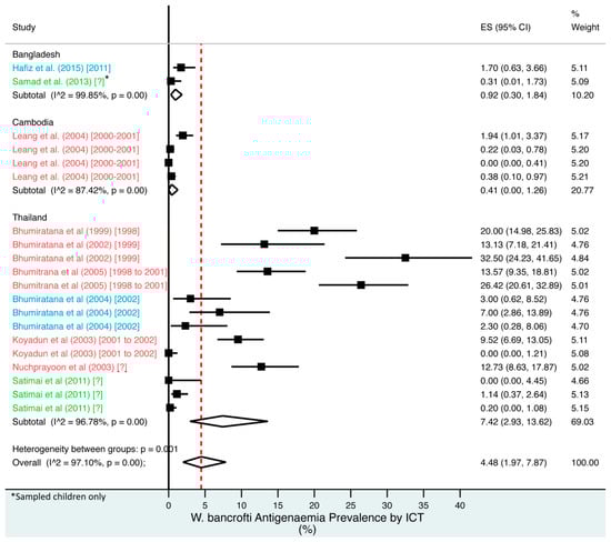 The following are available online at www.mdpi.com/2414-6366/2/3/32/s1. Table S1: Quality Assessment of Included Peer-Reviewed Journal Articles; Table S2: Infection and Morbidity Prevalence by Country and Region in Peer-Reviewed Journals; Table S3: Infection and Morbidity Prevalence by Country and Region in Grey Literature; Figure S1: Percentage estimates of W. bancrofti microfilaraemia prevalence by country and year; Figure S2: Percentage estimates of B. malayi microfilaraemia prevalence by country and year; Figure S3: Percentage estimates of Og4C3 antigenaemia prevalence by country and year; Figure S4: Percentage estimates of IgG4 antibody prevalence by country and year; Figure S5: Percentage estimates of combined microfilaraemia prevalence in Northeast India; Figure S6: Percentage estimates of combined microfilaraemia prevalence in Thailand; Figure S7: Percentage estimates of ICT antigenaemia prevalence in Thailand; Figure S8: Percentage estimates of hydrocoele prevalence in Thailand; Figure S9: Percentage estimates of combined morbidity prevalence in Thailand. Figure S10: PRISMA checklist.
