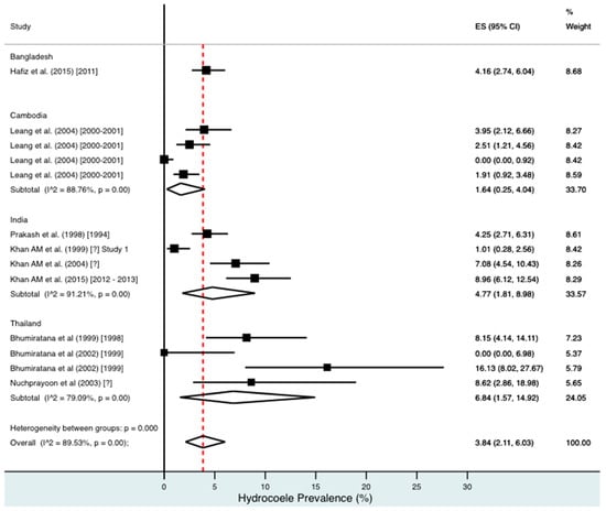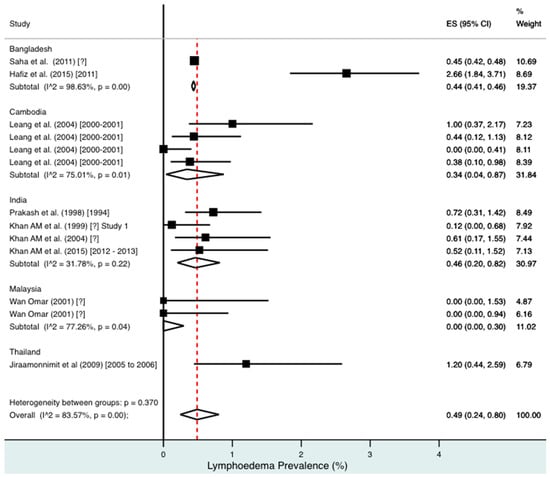 The prevalence of lymphoedema and hydrocoele found in tea-estate populations was 0.12–0.72% and 1.01–8.96%, respectively [32,37,39,40,41,51]. One study assessed morbidity in a non-tea-estate community and found no clinical cases [40].