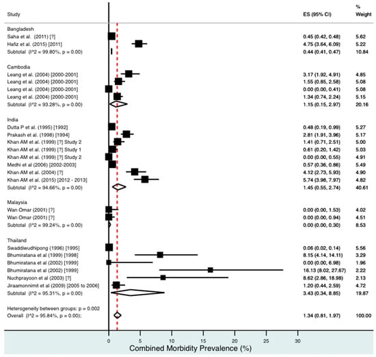 A modified bias risk assessment tool was developed to evaluate included studies. It was based on the Crowe and GATE validated critical appraisal tools [20,21]. Risk of bias was assessed by one reviewer on the basis of five independent factors: total sample size (>1000, 300–1000 or <300), sampling of location (representative randomisation, not stated/unclear or non-representative), sampling of participants (representative randomisation, not stated/unclear or non-representative), assessment of infection (internationally accepted methodology, not stated/unclear or non-consensus methods) and assessment of morbidity (independently assessed, not stated/unclear or patient reported). A total risk of bias score was generated by allocating zero, one or two points for each factor. The quality assessment was used to interpret the reliability of each study’s results. Because of the limited number and significant quality variation between studies, the bias assessment was not incorporated directly into the meta-analysis.
