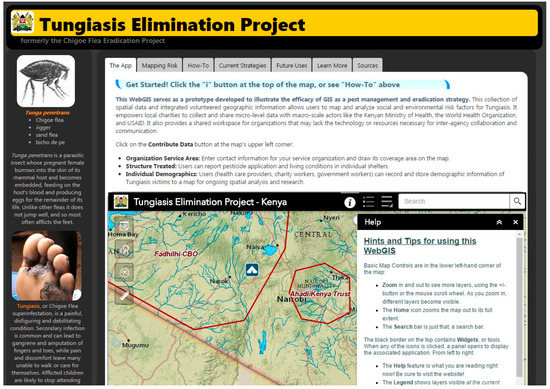 Prior to Wright’s study (2017), no VGI-based database developed specifically for WHO tungiasis reclassification existed, nor had a web GIS been proposed to house both georeferenced socioeconomic and epidemiologic data collected by aid workers and peer-reviewed publications. Thanks in large part to recent advances in web mapping technologies, it is now possible to provide standardized GIS workflows to multiple organizations battling the same disease across great distances. The Tungiasis Elimination Project (TEP) application, shown in Figure 1, serves aid workers and non-governmental organizations (NGOs) in developing strategies to manage tungiasis [63]. Future versions of the TEP will enable field data collection using readily available mobile mapping tools such as Esri’s Collector for ArcGIS application, which can be augmented with a Bluetooth-connected global navigation satellite system receiver in areas where cellular service is not available.