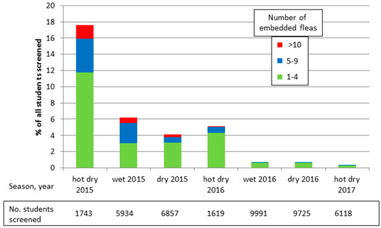 - Heuklbach, J.; Wilcke, T.; Harms, G.; Feldmeier, H. Seasonal Variation of tungiasis in an endemic community. Am. J. Trop. Med. Hyg. 2005, 72, 145–149. [Google Scholar]