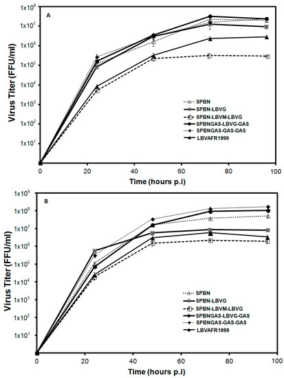 Viral replication rate has been linked to pathogenicity of the virus [12,13]. We investigated the growth kinetics of recombinant RABVs in which the G only or M and G genes were replaced with corresponding LBV genes (Figure 2). Multi-step growth curves (Figure 2A) showed that SPBN and SPBNGAS-GAS-GAS had the highest growth rate followed by SPBN-LBVG and SPBNGAS-LBVG-GAS. While there was no statistically-significant difference between the growth rate of these viruses (p > 0.05), the growth rate of SPBN-LBVM-LBVG was lower than that of the other viruses including LBVAFR1999. The single-step growth curves yielded similar results, with SPBNGAS-GAS-GAS, SPBNGAS-LBVG-GAS and SPBN producing the highest titers, and SPBN-LBVM-LBVG and LBVAFR1999 again producing the lowest titers (Figure 2B). SPBN-LBVG also produced a lower titer, however it was still higher than that of SPBN-LBVM-LBVG.