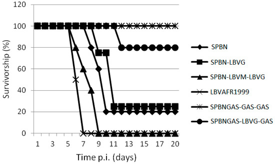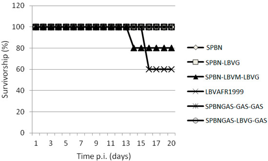 Pathogenicity of SPBN, SPBN-LBVG, SPBN-LBVM-LBVG, LBVAFR1999, SPBNGAS-GAS-GAS and SPBNGAS-LBVG-GAS in mice. Groups of 5 (Crl:CD1 [ICR]) mice were inoculated via the i.m. route with 5 × 106 TCID50/50 μL of virus. The experiment was terminated after 43 days, but no clinical signs were observed 16 days post infection.