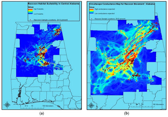 Maxent raccoon location probability map based on raccoon sample ((a); n = 1168; 5 January 2012–26 June 2014) locations, annual mean precipitation, annual mean temperature, elevation, land cover/land use, human population density, housing density, Euclidean distance to roads, USDA Soil Taxonomic Order, Euclidean distance to streams/rivers, and Euclidean distance to water bodies for central Alabama; and Circuitscape conductance map for raccoon rabies risk in Alabama (b).