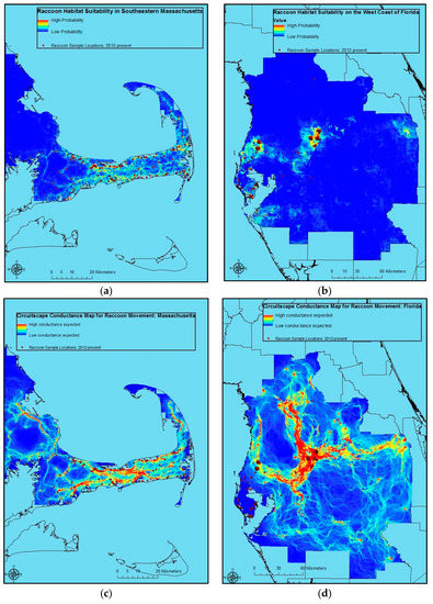 Maxent raccoon location probability map based on samples from Massachusetts(a; n = 171) and Florida (b; n = 431) collected during 5 January 2012–26 June 2014) plus annual mean precipitation, annual mean temperature, elevation, land cover/land use, human population density, housing density, Euclidean distance to roads, USDA Soil Taxonomic Order, Euclidean distance to streams/rivers, and Euclidean distance to water bodies; and related Circuitscape conductance maps for raccoon rabies risk in Massachusetts (c) and Florida (d).