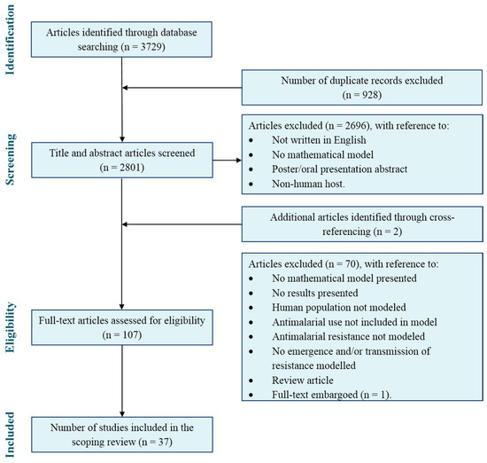 In the final stage of the review, the articles were then categorized as modeling the (i) emergence of antimalarial resistance; (ii) transmission of antimalarial resistance; or (iii) emergence and transmission of antimalarial resistance. The impact of antimalarial use and each category was then assessed and discussed (drug selection pressure), as well as other influencing factors that were taken into account in the model (P. falciparum, host immunity, transmission intensity, and vector control).